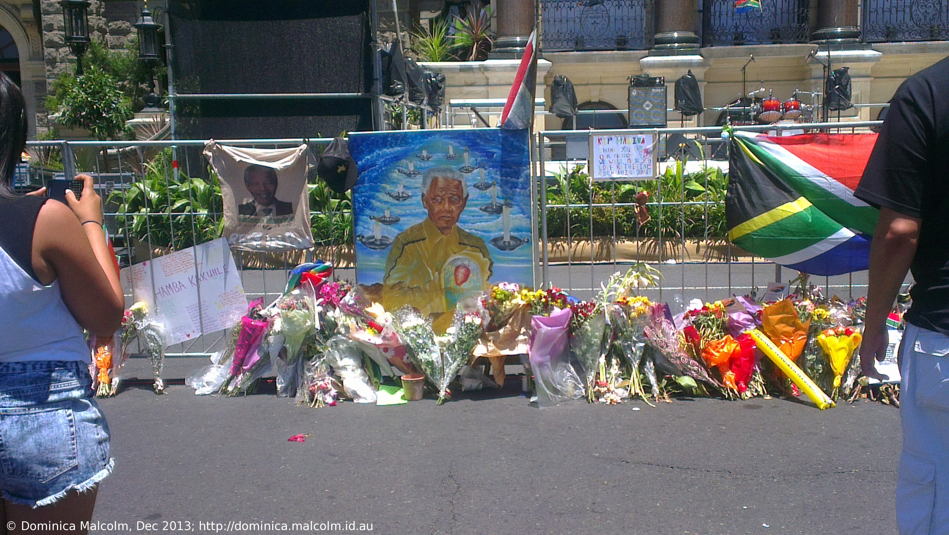 I headed in the direction of the Castle of Good Hope because I was curious about what that was, and ended up happening across City Hall, where a few people were offering flowers up, and countless more were gathered in a circle, dancing and singing, celebrating the life of Mandela. I was so overwhelmed with emotion just being there and feeling it escaping the pores of those around me that I ending up having tears streaming down my face, even though no one else seemed to be crying. There was one guy there in particular that I noted for he was carrying a sign that read, “South Africa without Madiba is shameful.”