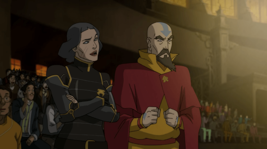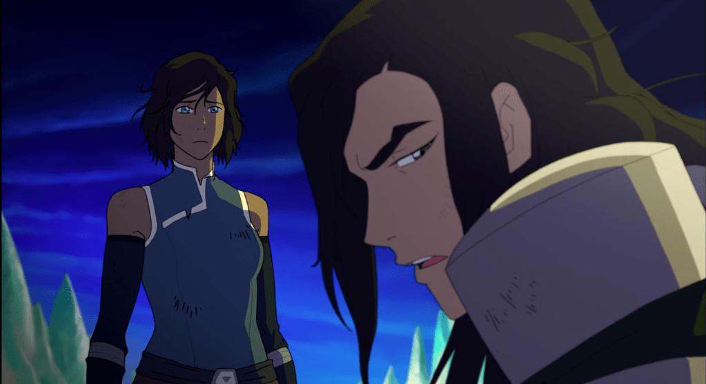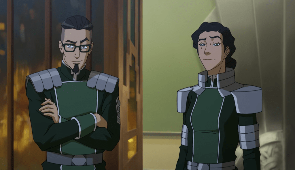 Fortunately, once Eska’s father is defeated, and she’s been confronted with the realisation that her father is actually a bad person who doesn’t really care about her or her twin brother, she’s able to move on and leave Bolin alone, so he’s able to explore other romantic relationships later in the series. Yes, I’ll be discussing those, too, because it takes him a while to figure things out. Another thing to note here is that Eska’s treatment of Bolin can be explained by being raised by a manipulative, uncaring father, but it is not an excuse (not everyone who is raised that way treat other people with such disrespect), and not everyone who tries to control their romantic partners is raised by an awful parent. Messaging on appropriate and inappropriate behaviour can come from various sources. I’m glad the series let these two end things here, rather than going on to suggest that Bolin’s love for Eska could change her, because that’s the kind of unhealthy messaging that seems more common in film and television.
