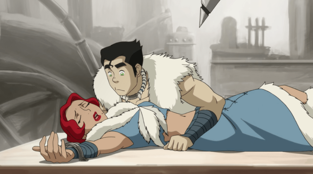Bolin’s second “romance,” if you can call it that, is one I also find disturbing, but for different reasons than his relationship with Eska. It’s during the same season as his relationship with Eska, while Bolin is starring in a mover. Bolin plays Nuktuk, Hero of the South, in a series of propaganda movers designed to convince Republic City to support the Southern Water Tribe in their fight against Unalaq. Ginger plays his love interest in the movers, and for some reason Bolin is unable to separate fantasy from reality. Who the characters are, versus who the actors are. Ginger very clearly gives Bolin the cold shoulder when they’re not on set, but somehow he still thinks they’re together. I guess it bothers me somewhat because it seems like they lowered Bolin’s intelligence level in order for him to believe this. Sure he’s a bit naïve, but he’s still generally recognised and respected girls’ wishes up until that point (even to the extent of being a pushover in his relationship with Eska). Could this be an indication of the impact being in a controlling relationship had on him? I’m not sure. I have read that abuse survivors are more likely to end up in similar relationships in the future (Ginger isn’t controlling or abusive in this case, but she is emotionally distant and elusive) until they’re able to look within to recognise their patterns and deal with the trauma that makes them more at risk of being in those types of relationships. What trauma has Bolin experienced in his life? His parents died when he was a kid, and he and his brother had to live on the streets and got involved in organised crime in order to survive. That’s pretty traumatic. I guess it also shows how easily someone who should know better can fall for someone who isn’t actually into them.