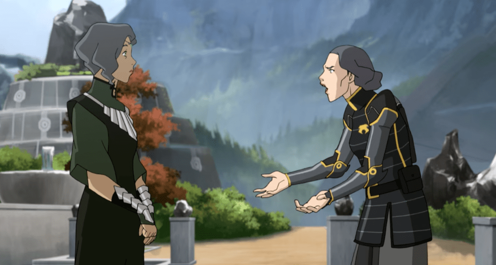 Though we meet Lin in the very beginning of the whole series, we don’t learn she has a sister until we’re introduced to her in season 3. This is because they’ve been estranged for years, by Lin’s choice. Korra and her friends show up in the metal city of Zaofu after they learn of a new airbender there (Opal, who I talked about earlier). Lin is with them because she is trying to protect Korra while Zaheer is after her, desiring to take Korra back to Republic City where Lin believes she’ll be safest. When they arrive in Zaofu, Lin refuses to enter the city, but won’t say why. It doesn’t take long before she is found out, however, and we learn it’s because her sister created the city, and she does not want to talk to Suyin.