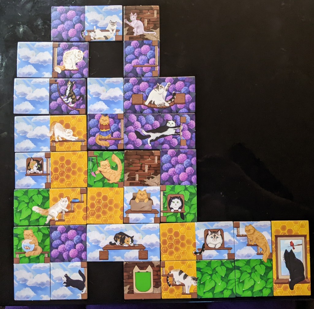 - Play both your kept cat tile and the one you were passed anywhere on your cat tower, as long as it has support somewhere underneath it (i.e. it can be on the ground level or above an existing cat tile, but not adjacent to a piece above the ground level without another cat tile directly beneath it)