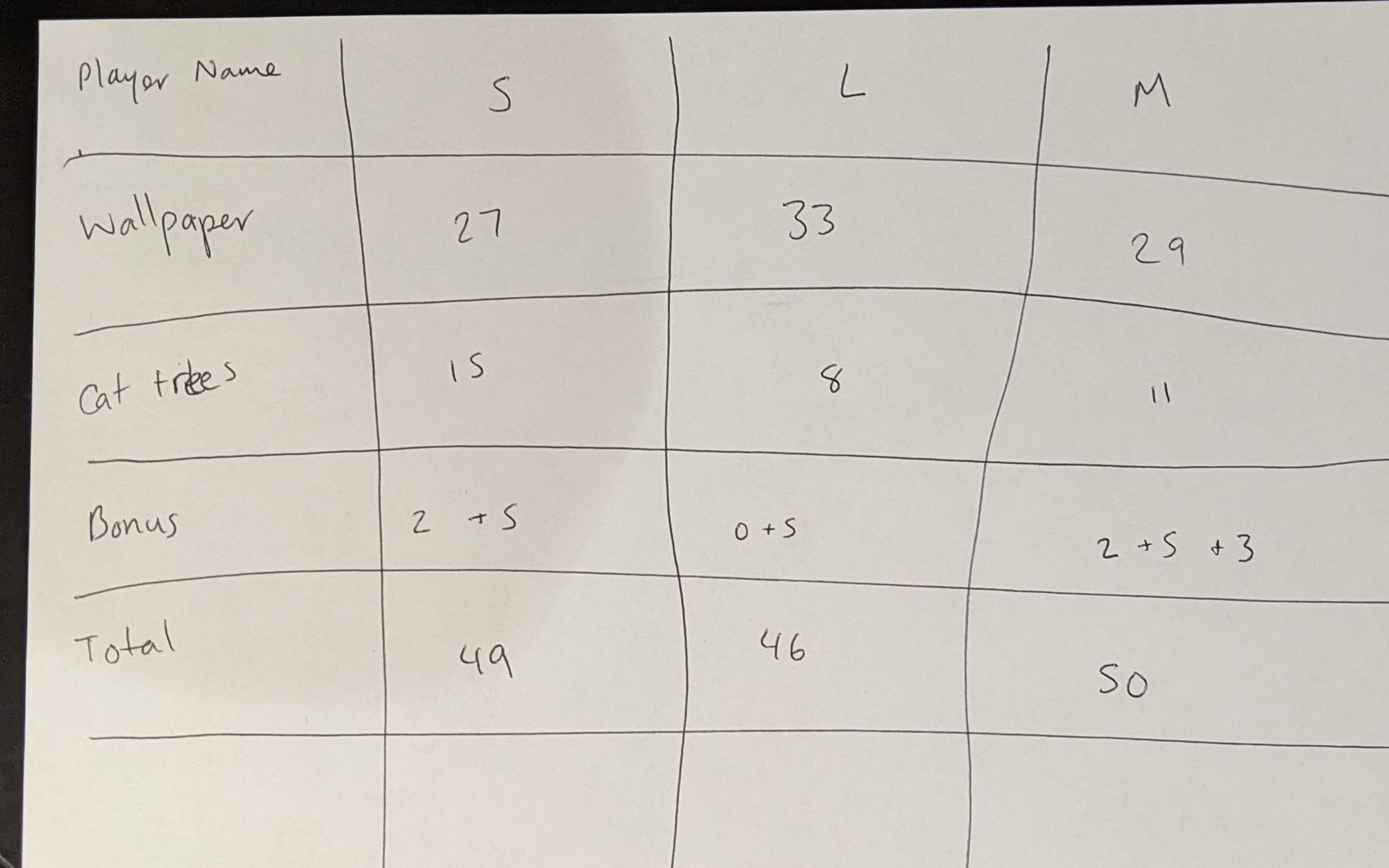 - Bonus points as a result of in-game rewards – i.e. making a match with your cats according to the the kitten bonus card grants you a “kitten tile” to place in your cat tree. The kitten tile gives you additional opportunities for points at the end of the game (matching wallpaper, because you can choose the wild wallpaper colour at the end of the game, and one point for each cat that adjoins the kitten tile)
